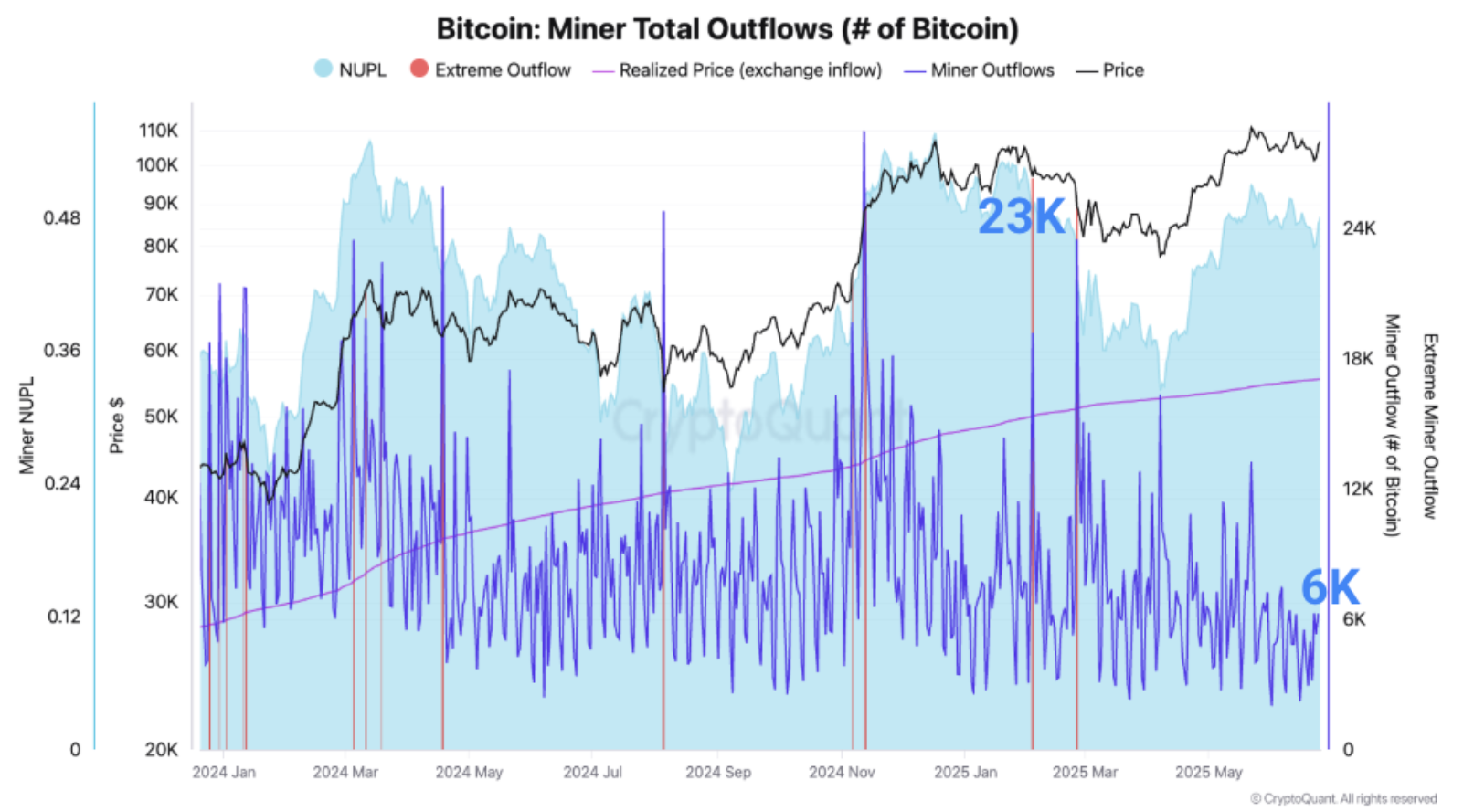 “Miner outflows have dropped from a daily peak of 23K BTC in February 2025 to roughly 6K BTC as of today. Moreover, there have not been any days with extremely high outflows since February, and Bitcoin transferred directly from miners to exchanges has also remained low.”
