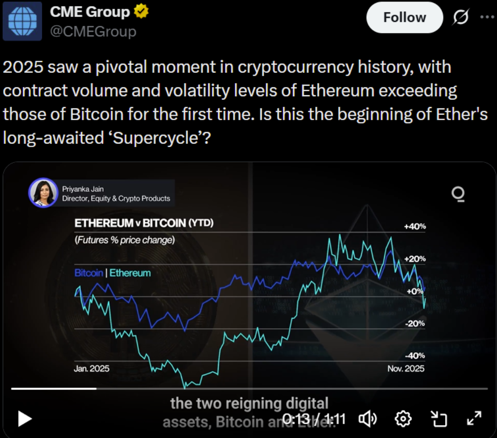 In a recent video, CME executive Priyanka Jain stated that ETH options are currently exhibiting higher volatility than Bitcoin options, a shift that appears to be attracting increased speculative and hedging activity.