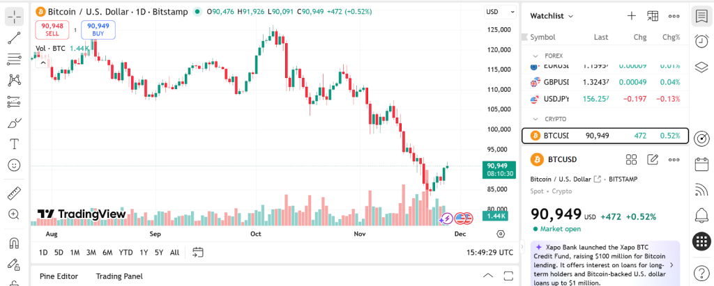 The Bitcoin price is trading around $90,949, supported by more than $70B in daily volume and a market cap above $1.8T. This week’s 5% rebound helped recover part of November’s drawdown, after BTC fell from highs above $120,000.