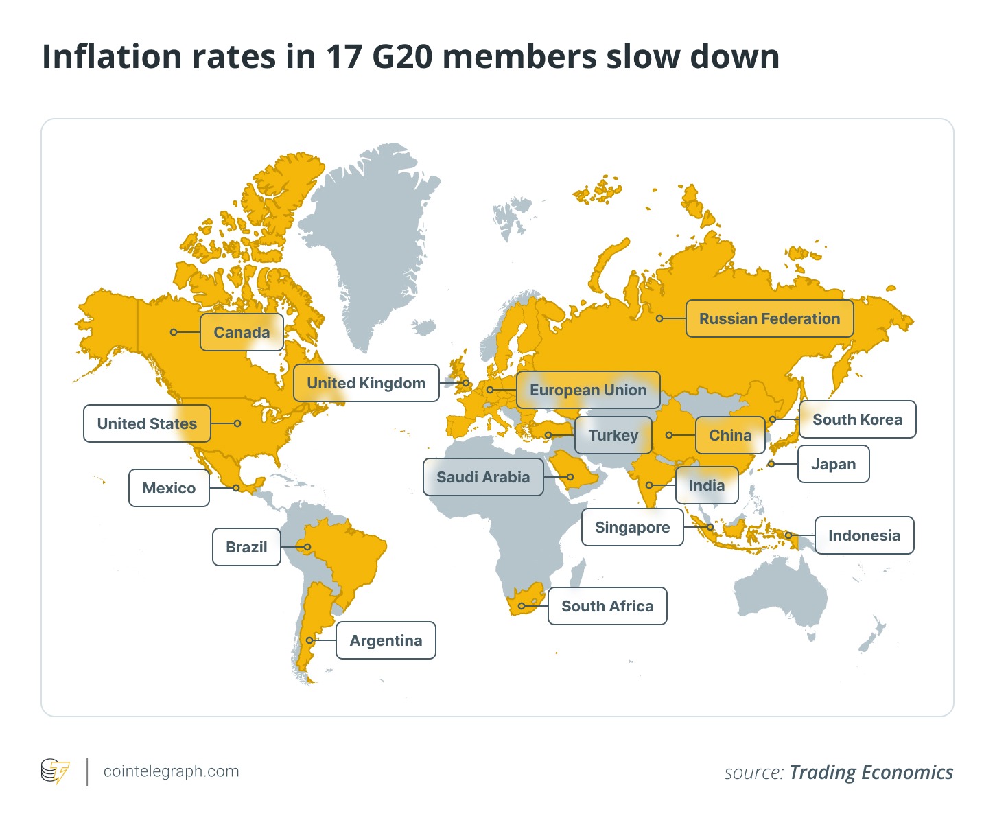 According to data from Trading Economics, global inflation slowed in November among major world economies. Seventeen members of the G20 experienced lower inflation on the month, part of a growing global trend.