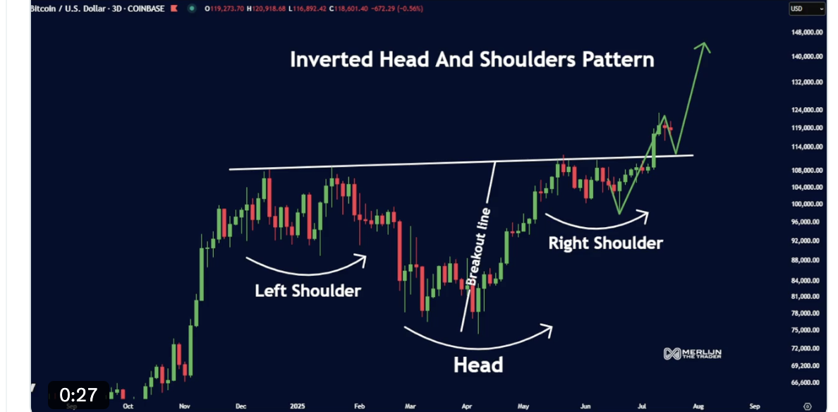 However, another classic pattern was spotted by Merlijn The Trader, a Bitcoin analyst, who says a BTC price target of $140,000 is in play based on an inverted head-and-shoulders pattern on the three-day chart.