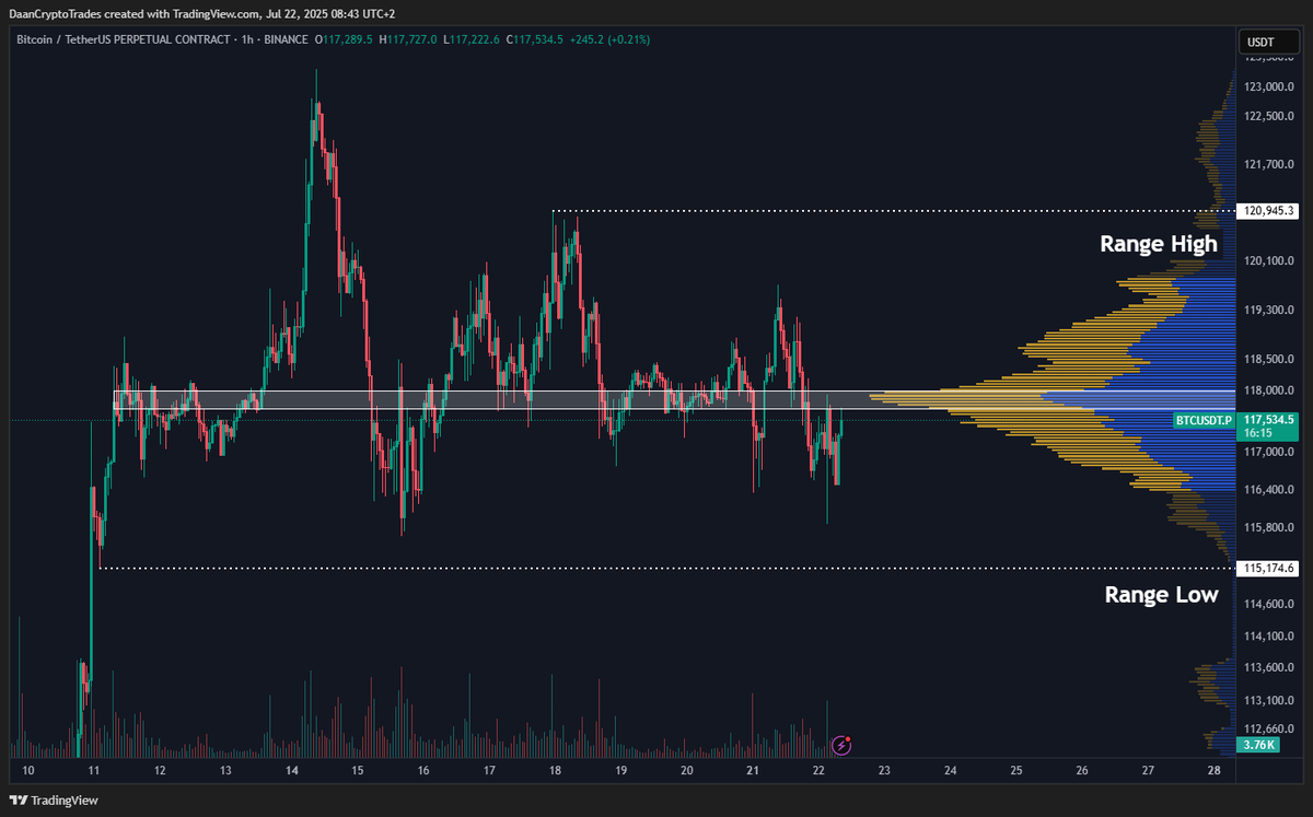 Fellow analyst Daan Crypto Trades said BTC price has stalled near its all-time high and noted that the bulk of the volume has been traded around $118,000, which is the middle level of the current range.