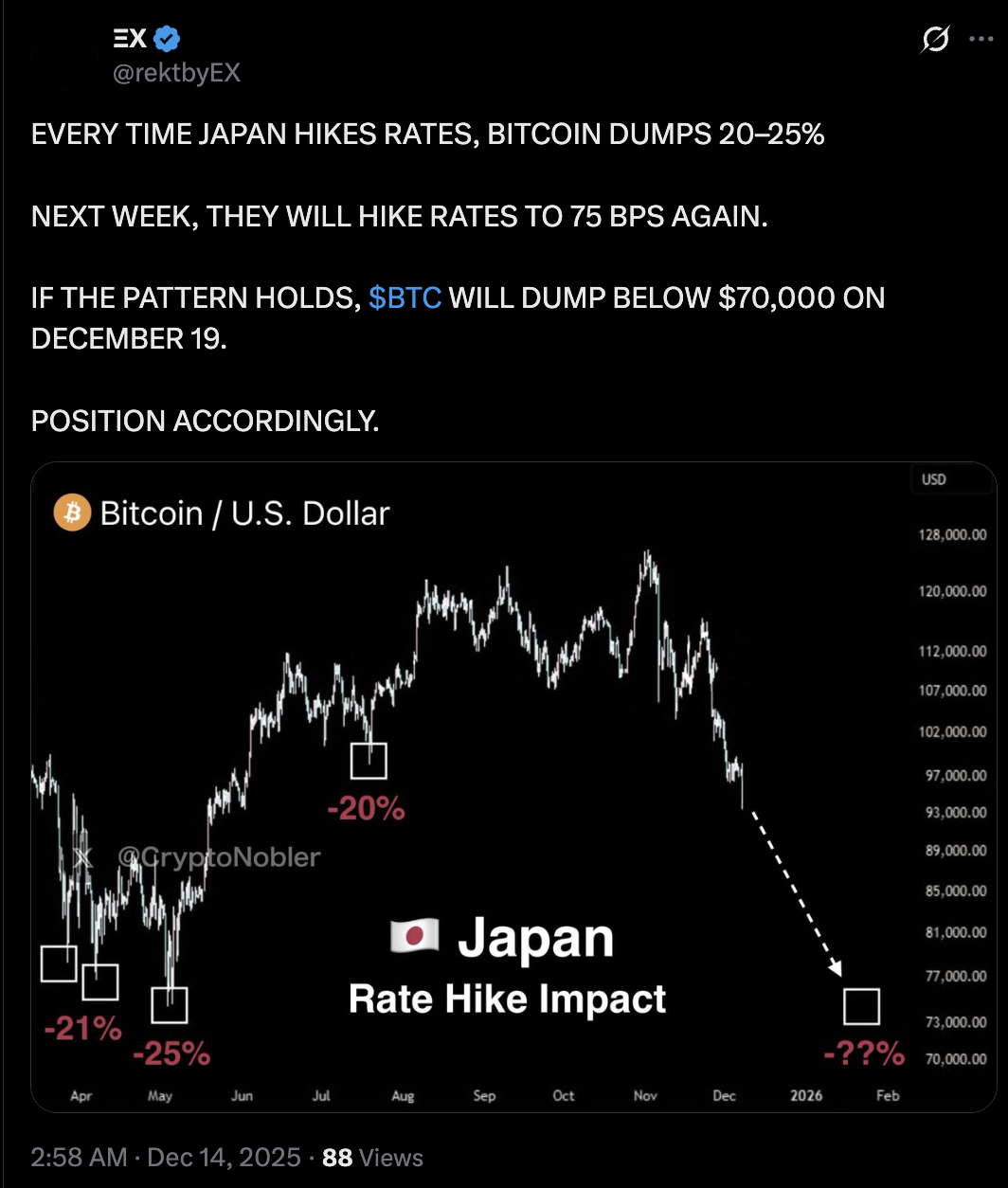 Bitcoin (BTC) could face a continued correction toward the $70,000 level if the Bank of Japan (BoJ) proceeds with an expected interest-rate hike on Dec. 19, according to multiple macro-focused analysts.