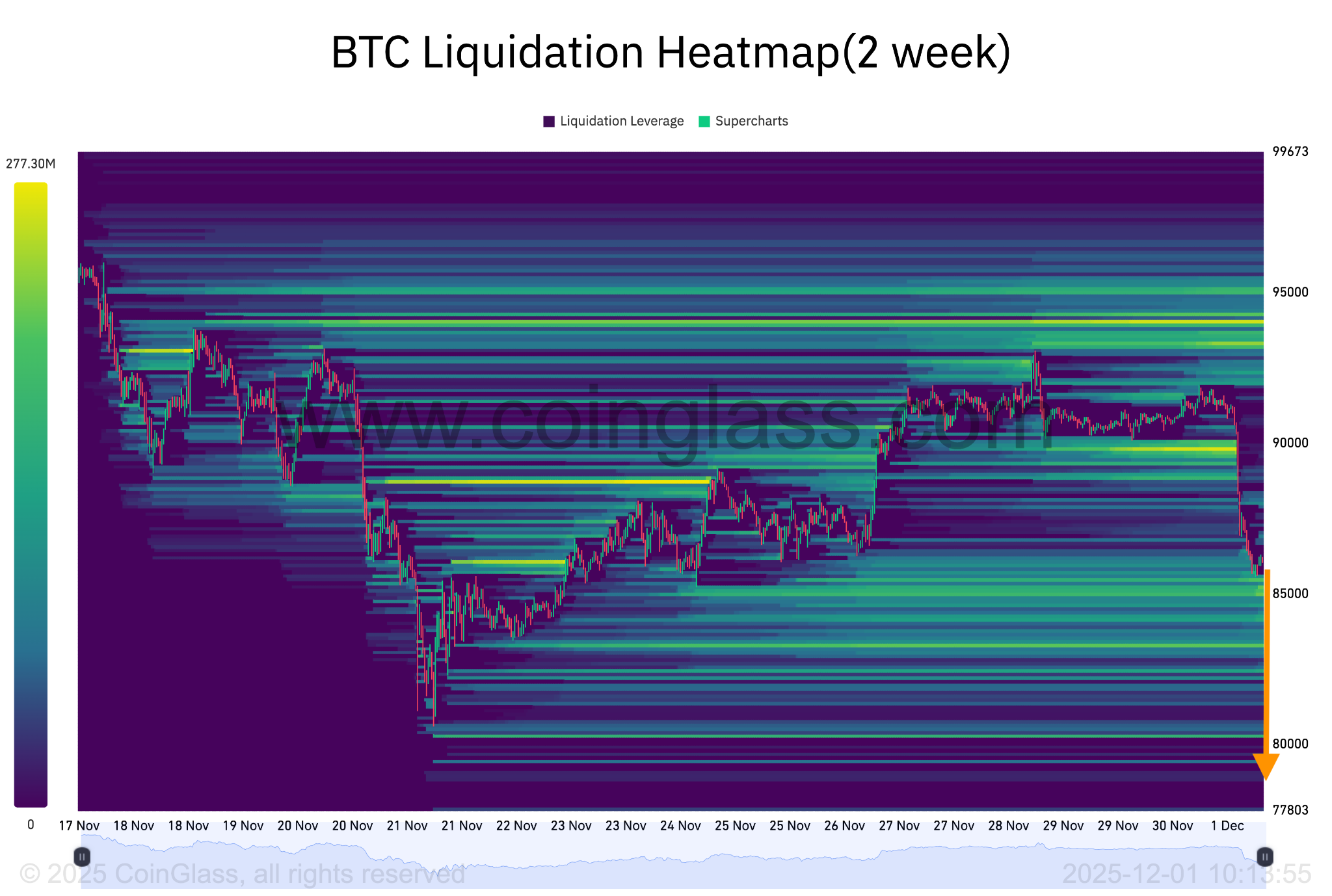 The Bitcoin liquidation heatmap showed the price eating away liquidity around $86,000, with millions in bid orders still sitting between the spot price and $79,600