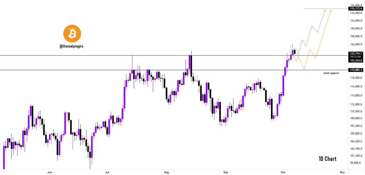 Market analysts said Bitcoin’s upside remained intact despite the 1.7% correction from its all-time high of $126,200 reached on Monday.