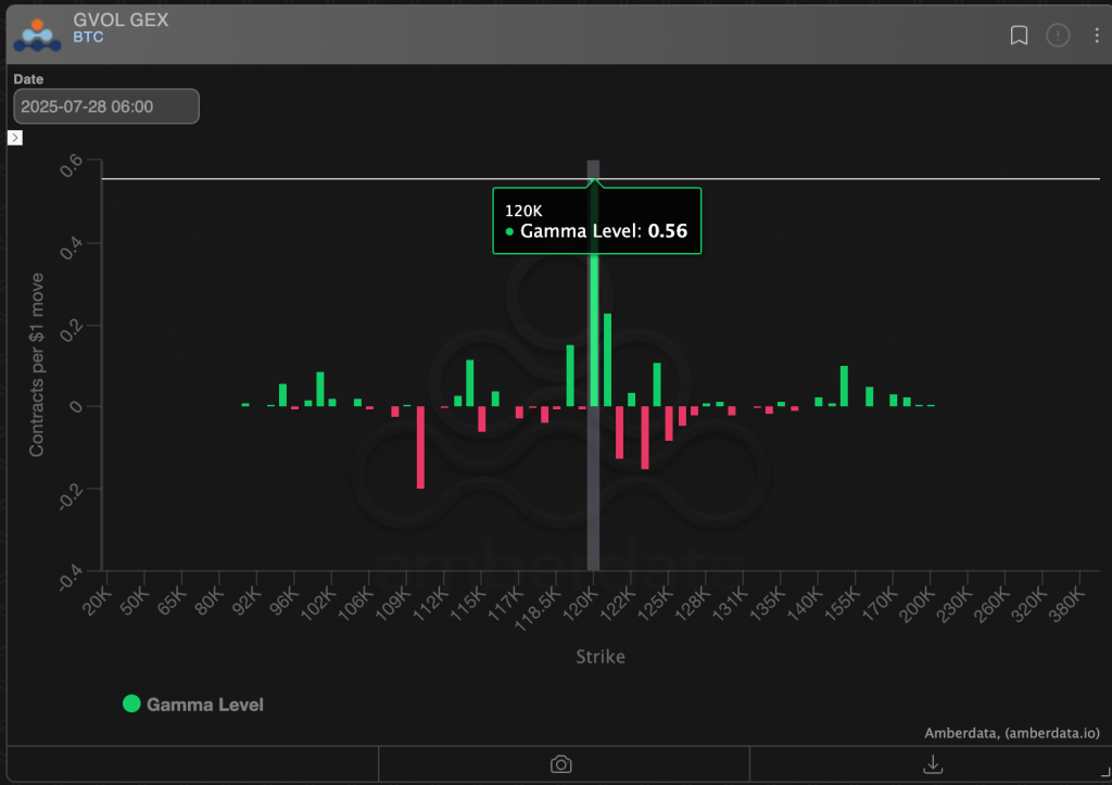 Bitcoin (BTC) continues to trade directionless near $120,000 amid data from the Deribit-listed options showing a significant positive dealer gamma at the $120,000 and $120,500 strikes. When dealers have a positive gamma exposure, they buy low and sell high to rebalance their net exposure to neutral, inadvertently arresting volatility.