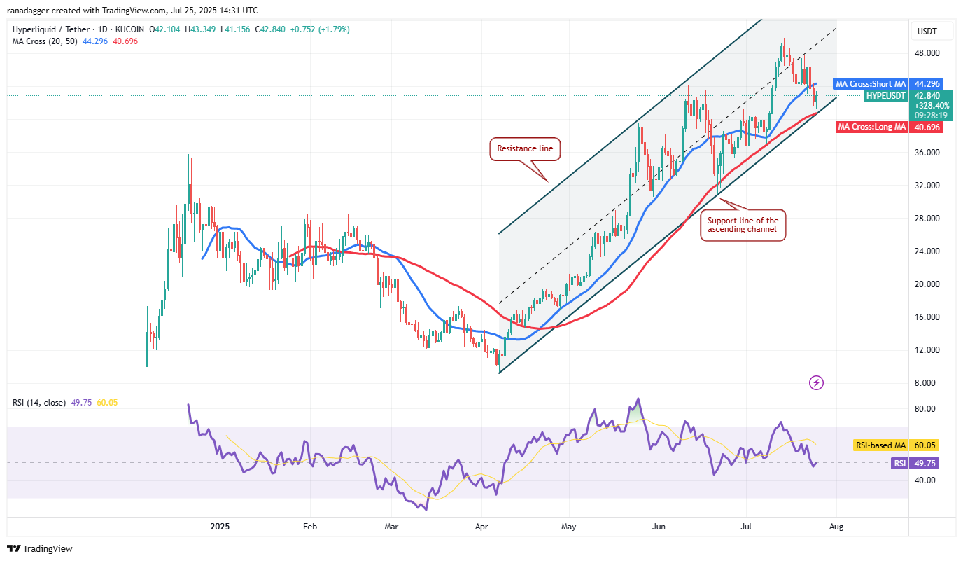 Hyperliquid (HYPE) broke below the 20-day SMA ($44.29) on Wednesday and has reached the support line of the ascending channel pattern.