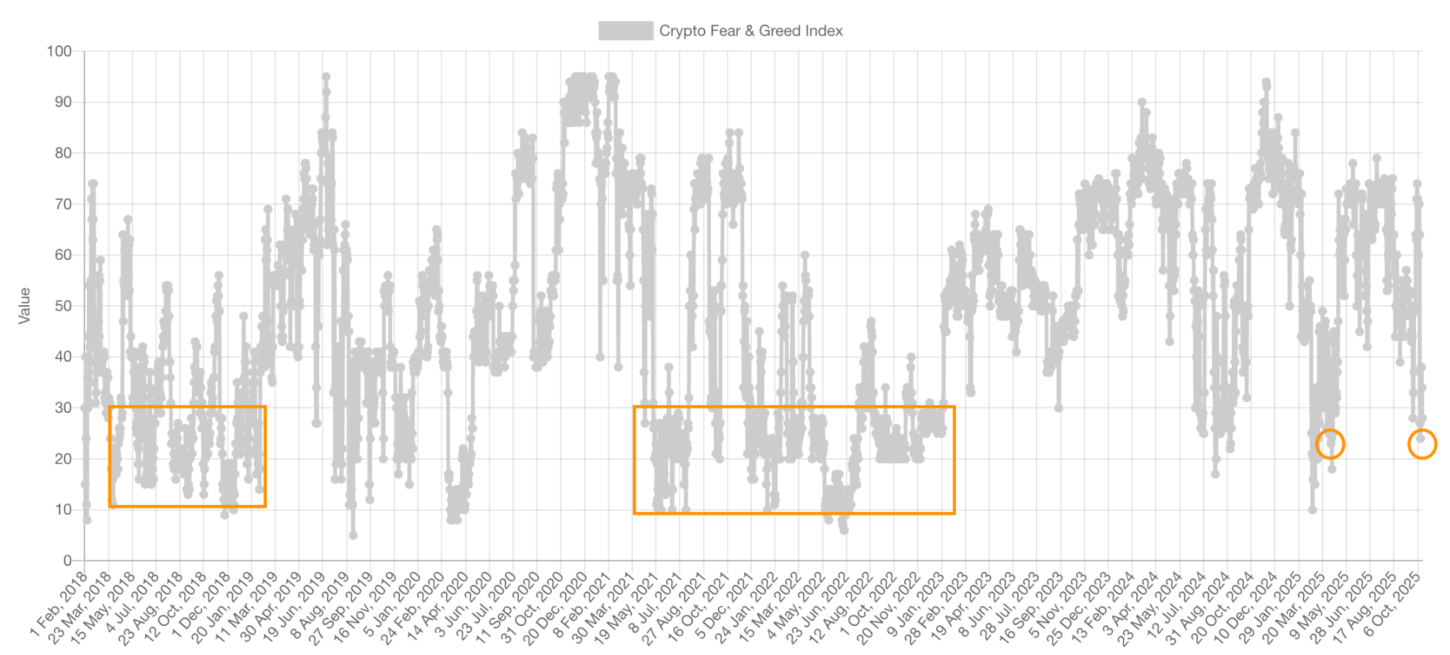 Crypto market sentiment is also at bear market levels, reflecting caution and lower investor participation.