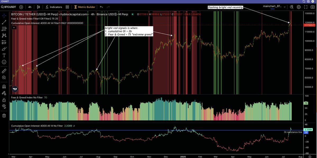 “Historically when this happens [and] Fear & Greed Index is in “Extreme Greed” territories –> we get local tops and corrections. Those bright red highlights are when both conditions occur. Historically, these play out over much longer timeframes, so don’t go rushing into a trade right away.”