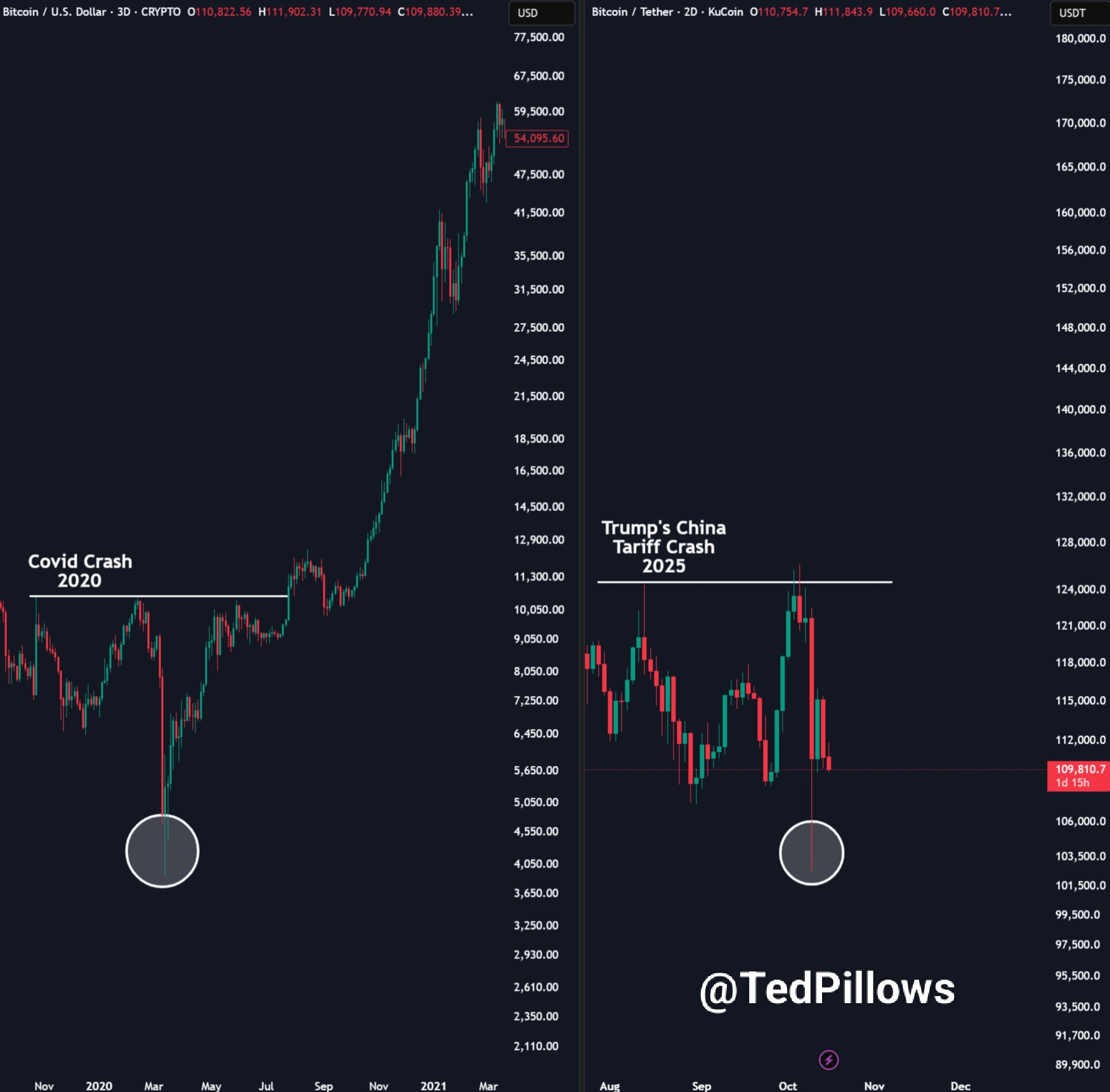 Pillows uploaded a chart comparing current BTC price action to that from the COVID-19 cross-market crash in March 2020.