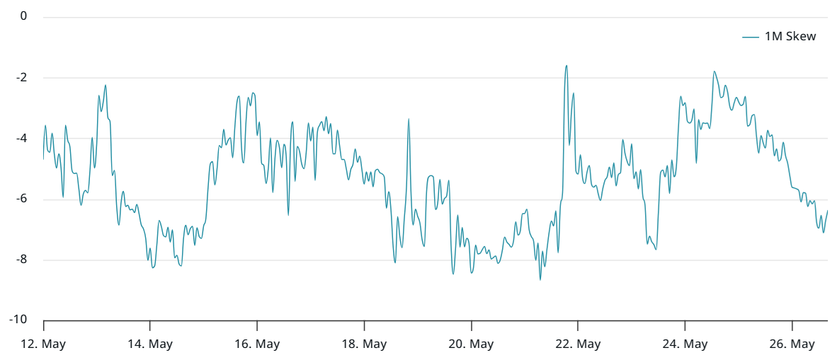 The negative 6% Bitcoin options delta skew indicates that put (sell) options are trading at a discount, a typical characteristic of bullish markets. Readings closer to zero reflect a more balanced demand between put and call (buy) options—a trend observed on May 25.