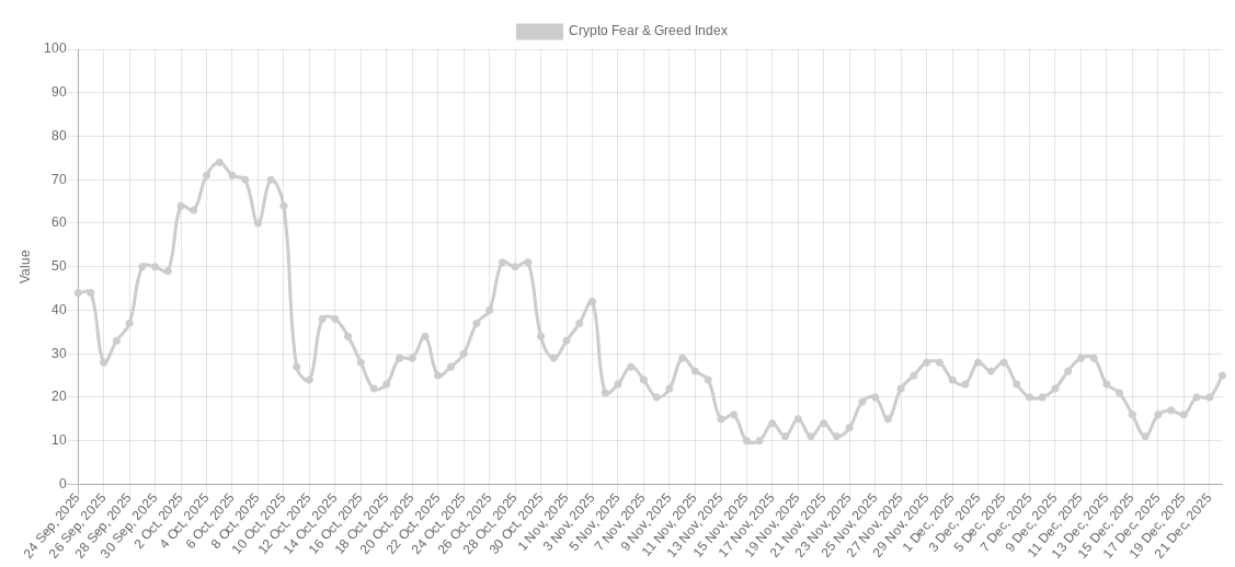 🚨 NOW: Crypto Fear and Greed Index climbs to 25 (Extreme Fear) from 16 last week, showing some sentiment improvement but still deep in fear territory. pic.twitter.com/sJx5R9CuXV