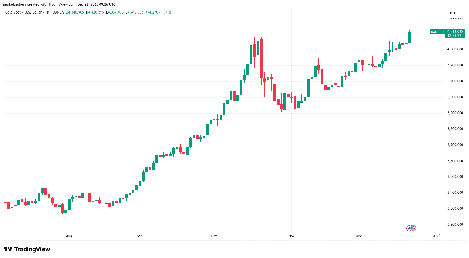 Gold reached $4,420 per ounce on Monday, while silver targeted the $70 mark for the first time, up nearly 150% in 2025.