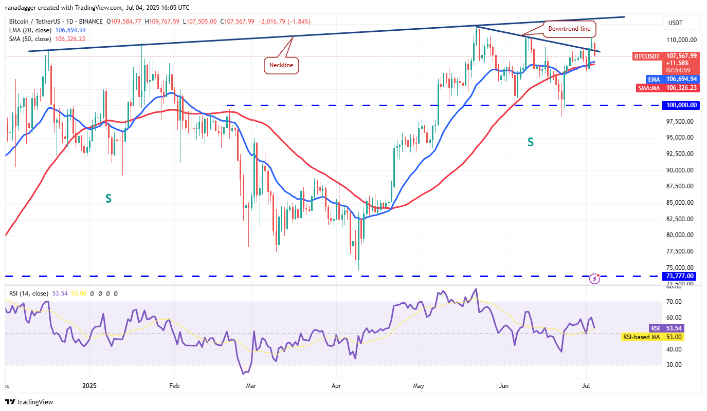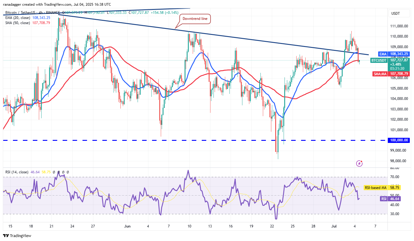 The pair has dipped to the 50-simple moving average (SMA) on the four-hour chart, where the bulls are trying to arrest the pullback. If the price turns up from the current level and breaks above the downtrend line, it signals demand at lower levels. The bulls will again try to shove the pair above $110,500. If they do that, the possibility of a rally to $113,500 increases.