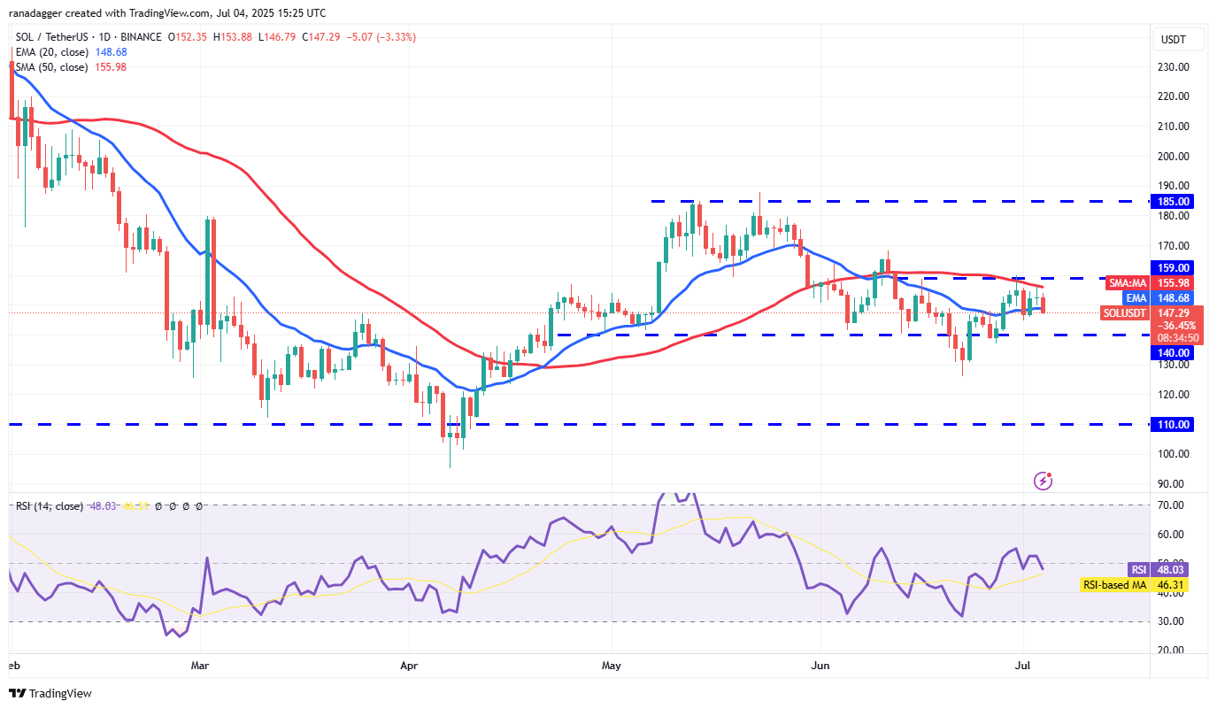 The flattish 20-day EMA and the RSI just below the midpoint signal a balance between supply and demand. Buyers will be back in the driver’s seat if they propel the SOL/USDT pair above $159. That clears the path for a rally to $168 and then to $185.
