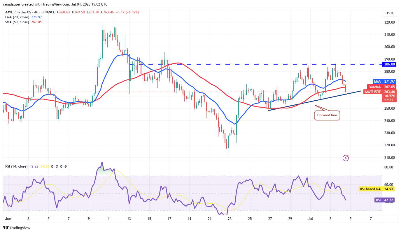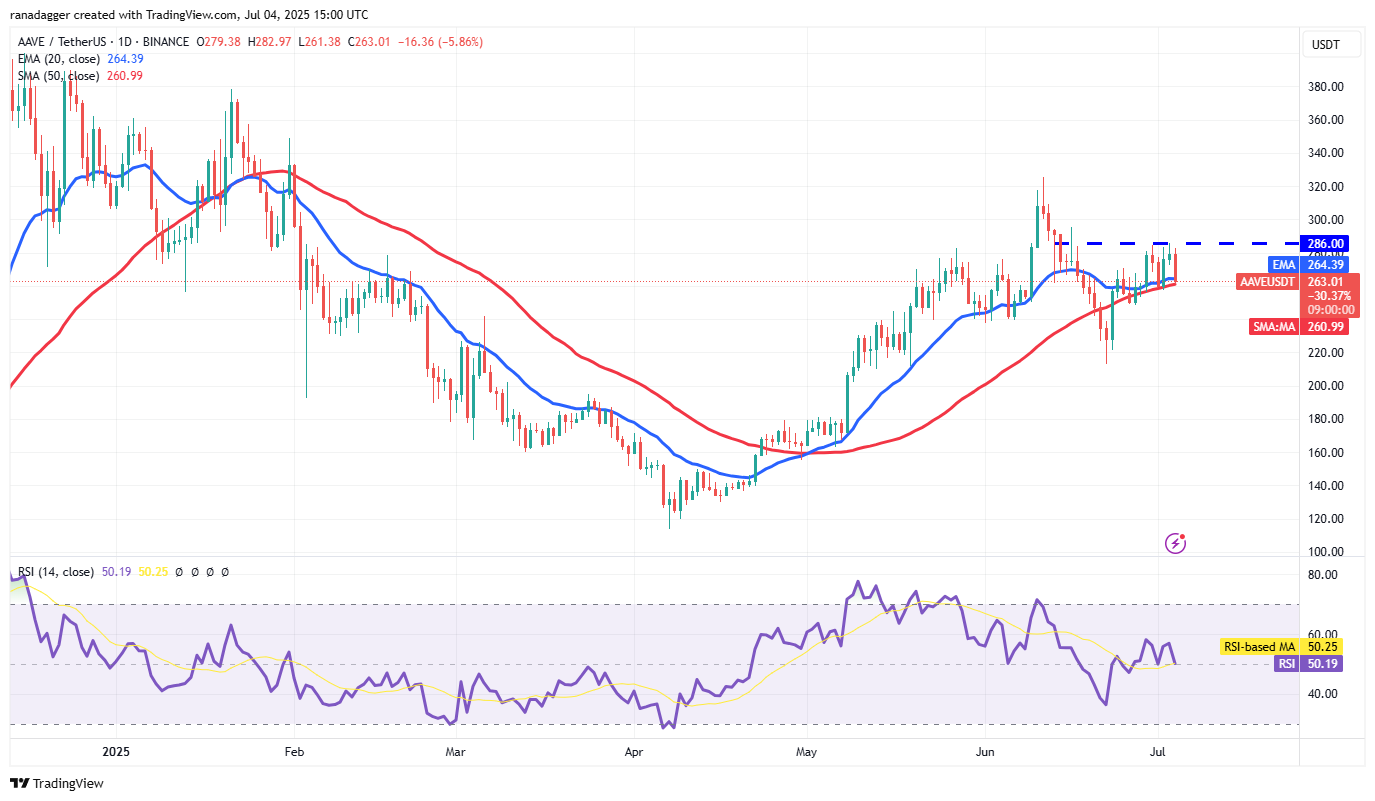 Aave (AAVE) is facing resistance at $286, but a positive sign is that the bulls have not allowed the price to dip below the moving averages.