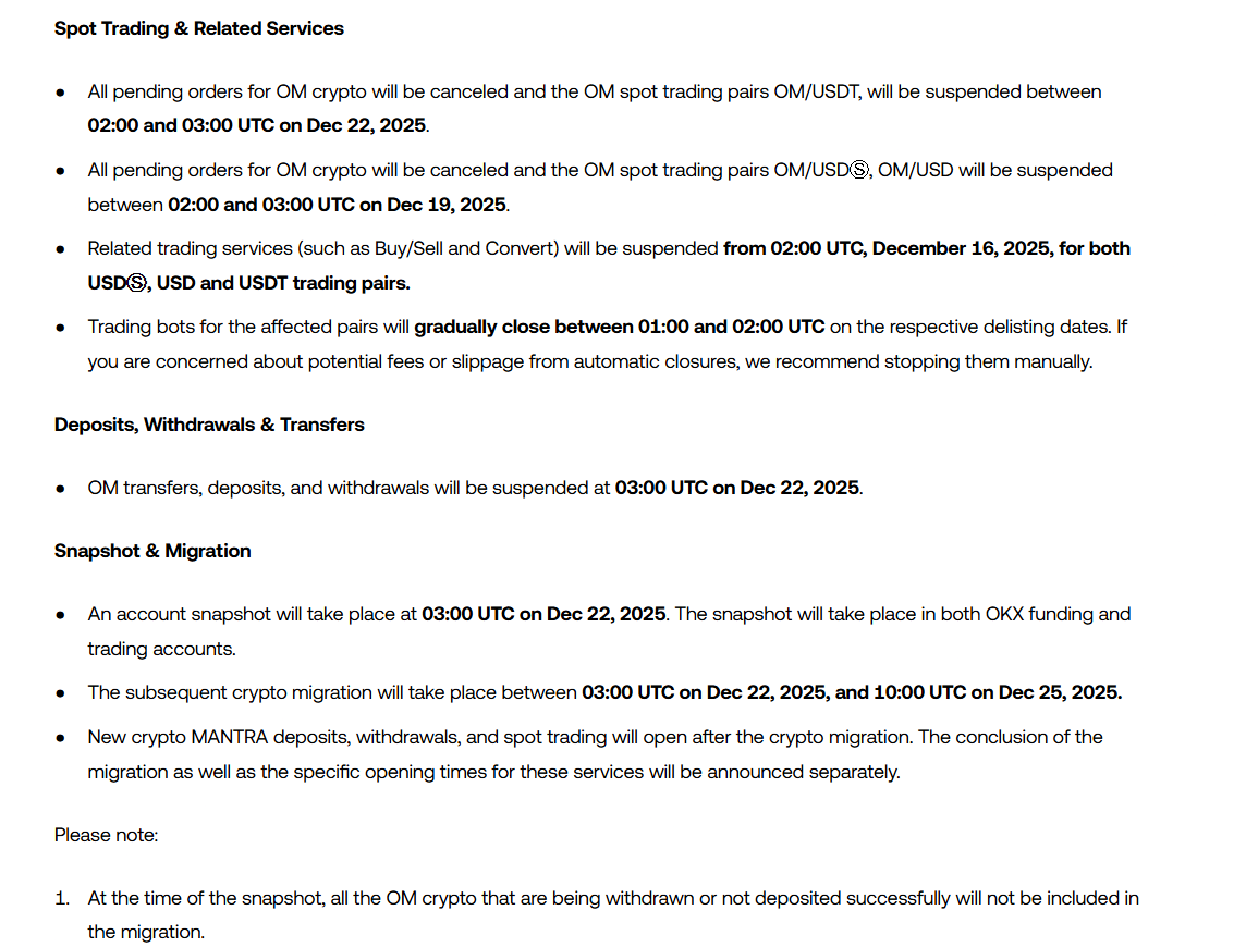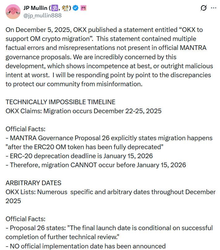 Mullin also said OKX’s post referenced “arbitrary dates throughout December 2025,” while Mantra has not yet announced an official implementation date.