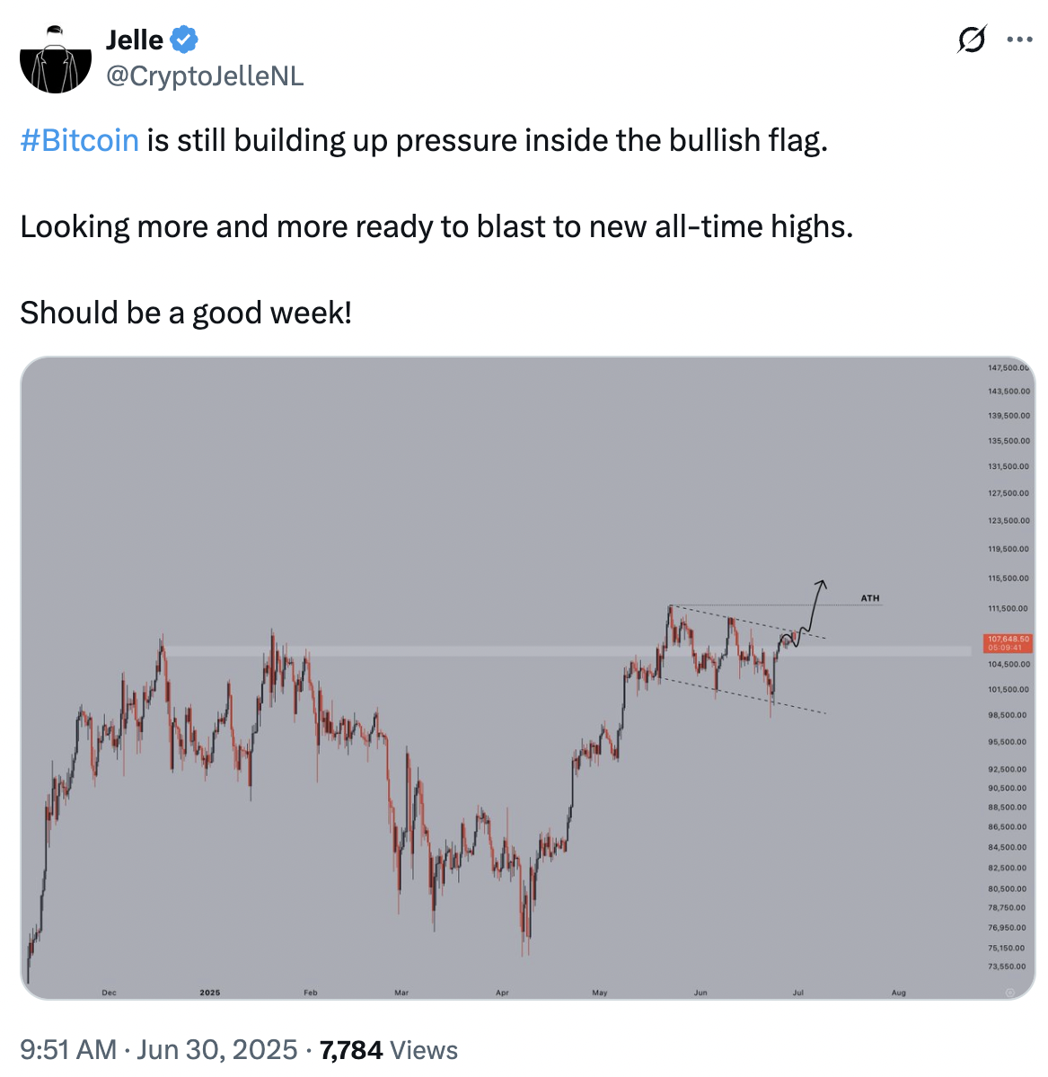 MN Capital founder Michael van de Poppe spotted Bitcoin hovering at $107,450, saying that after taking out some liquidity around $108,000, BTC may see a slight pullback before breaking out to all-time highs.