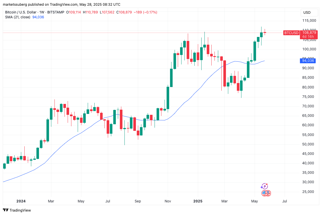 Continuing, Alan suggested that if sellers temporarily regain control, a downside target could involve a revisit of the 21-week moving average at around $94,000.