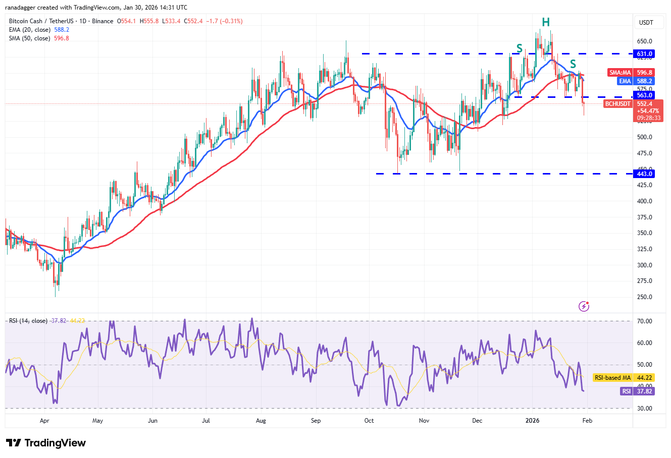 Bitcoin Cash (BCH) plunged below the $563 support on Thursday, completing a bearish head-and-shoulders pattern.