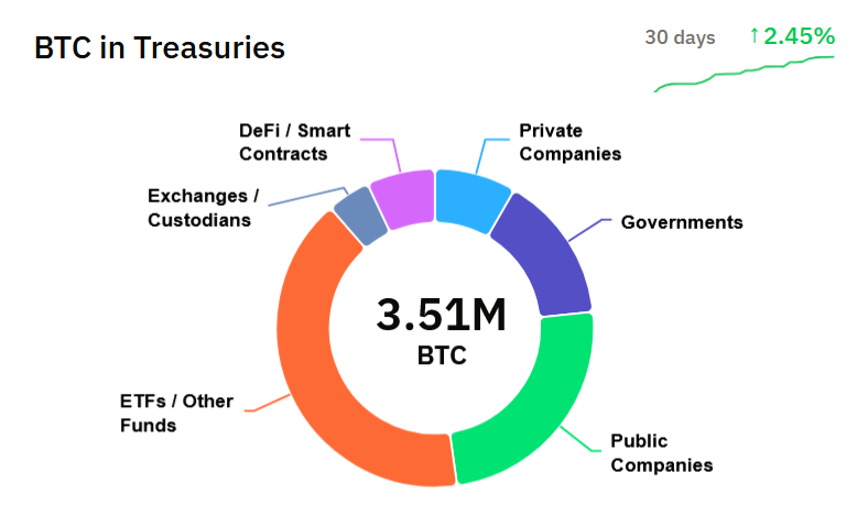 Bitcoin was built as a decentralized peer-to-peer system, but custodial ETFs and funds now hold over 1.4 million BTC—more than 6.6% of the total supply. Public and private companies hold another 1.1 million BTC (5.3%), and governments, mostly the US, around 500,000 (2.4%), according to BitcoinTreasuries.NET.