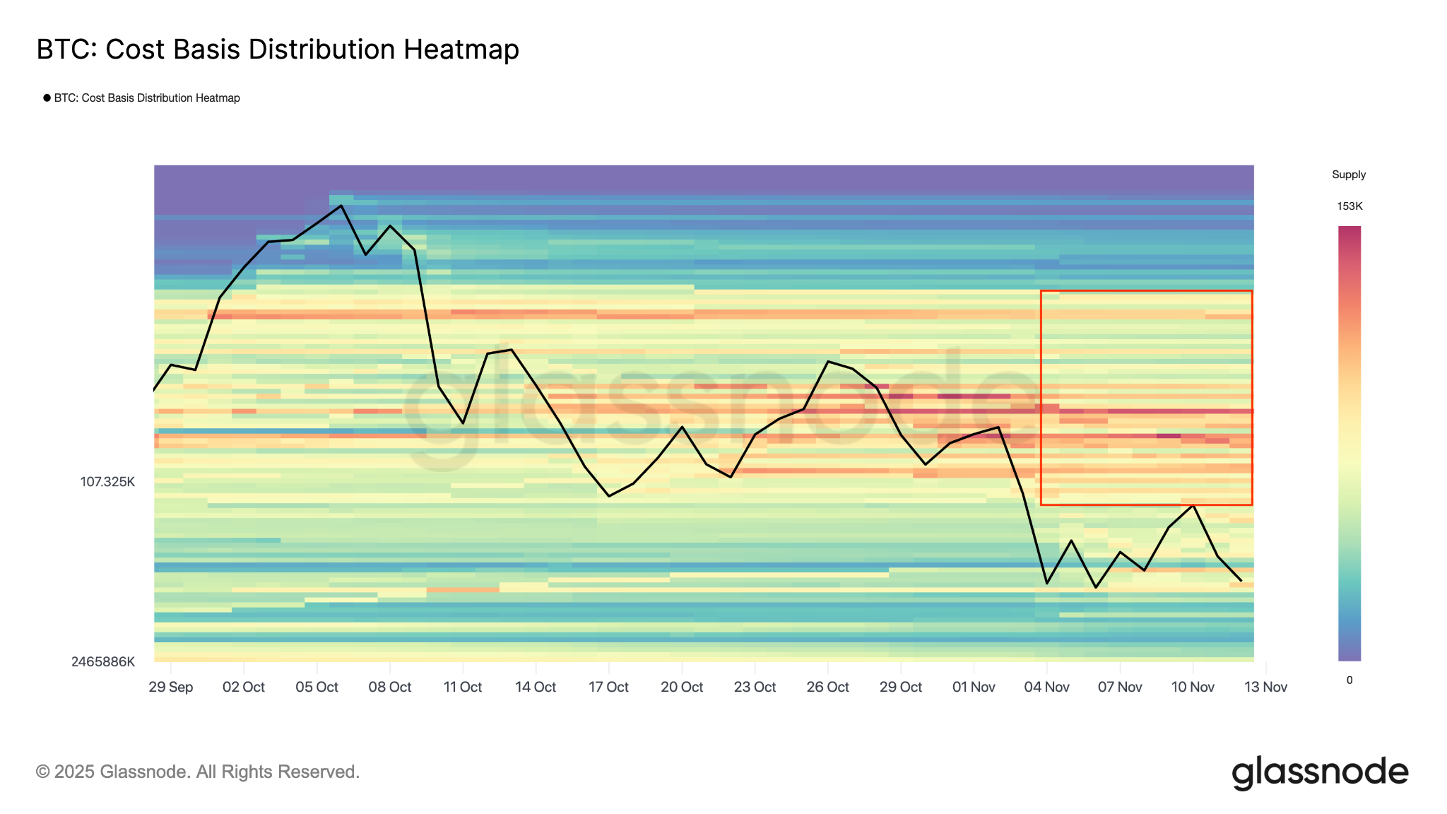 This is due to “a dense supply cluster between $106K and $118K that continues to cap upward momentum, as many investors use this range to exit near breakeven, said Glassnode.