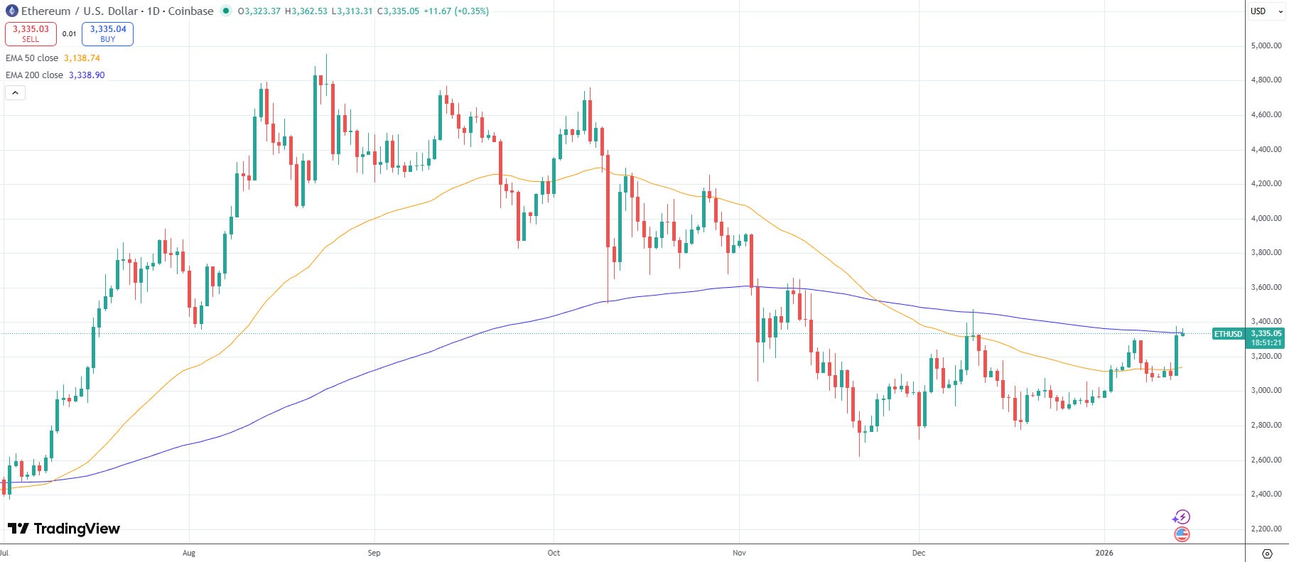 The asset tapped $3,375, its highest level since Dec. 10, on Coinbase in early trading on Wednesday, according to TradingView.