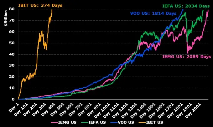 IEFA required 2,034 days to achieve the same level while IEMG required 2,089 days. In contrast, the BlackRock Bitcoin ETF achieved this in just over a year. However, and in complete contrast, IBIT pulled off the task within a little over a year.