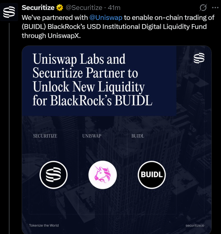 According to a Wednesday announcement, BlackRock’s USD Institutional Digital Liquidity Fund (BUIDL) will be listed on the Uniswap decentralized exchange, allowing institutional investors to buy and sell the tokenized security.