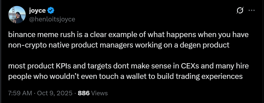 X user henloitsjoyce argued that “degen” products like memecoin launchpads don’t align with centralized exchanges’ performance goals or key metrics. Perhaps the real reason behind memecoins’ success lies in their lack of regulation and oversight. Still, traders likely sold off existing BNB Chain memecoins in anticipation of migrating to the newly announced platform.