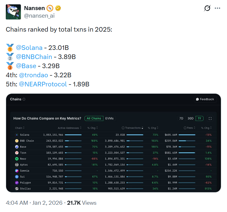 BNB Chain was among the busiest in 2025. Source: Nansen