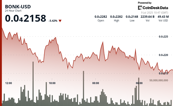 - Resistance at $0.000022–$0.0000222 remains intact, keeping BONK in a tight range.