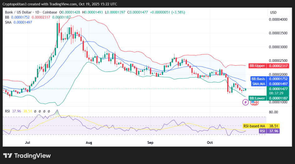 On October 19, 2025, Bonk price analysis reveals an upward trend as buying interest continues for a second consecutive day. The meme coin’s price increased to $0.00001477 today, after touching the $0.00001434 support yesterday. Concurrently, the cryptocurrency gained 3.68% of its value during the past 24 hours. Today’s market conditions bring hope for long-position investors, as the cryptocurrency is slowly regaining its lost value.
