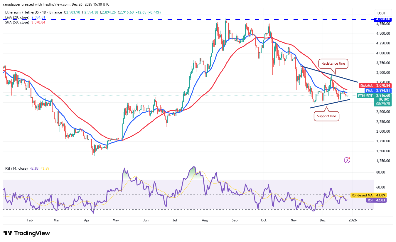 Ether (ETH) continues to trade inside the symmetrical triangle pattern, indicating a balance between supply and demand.