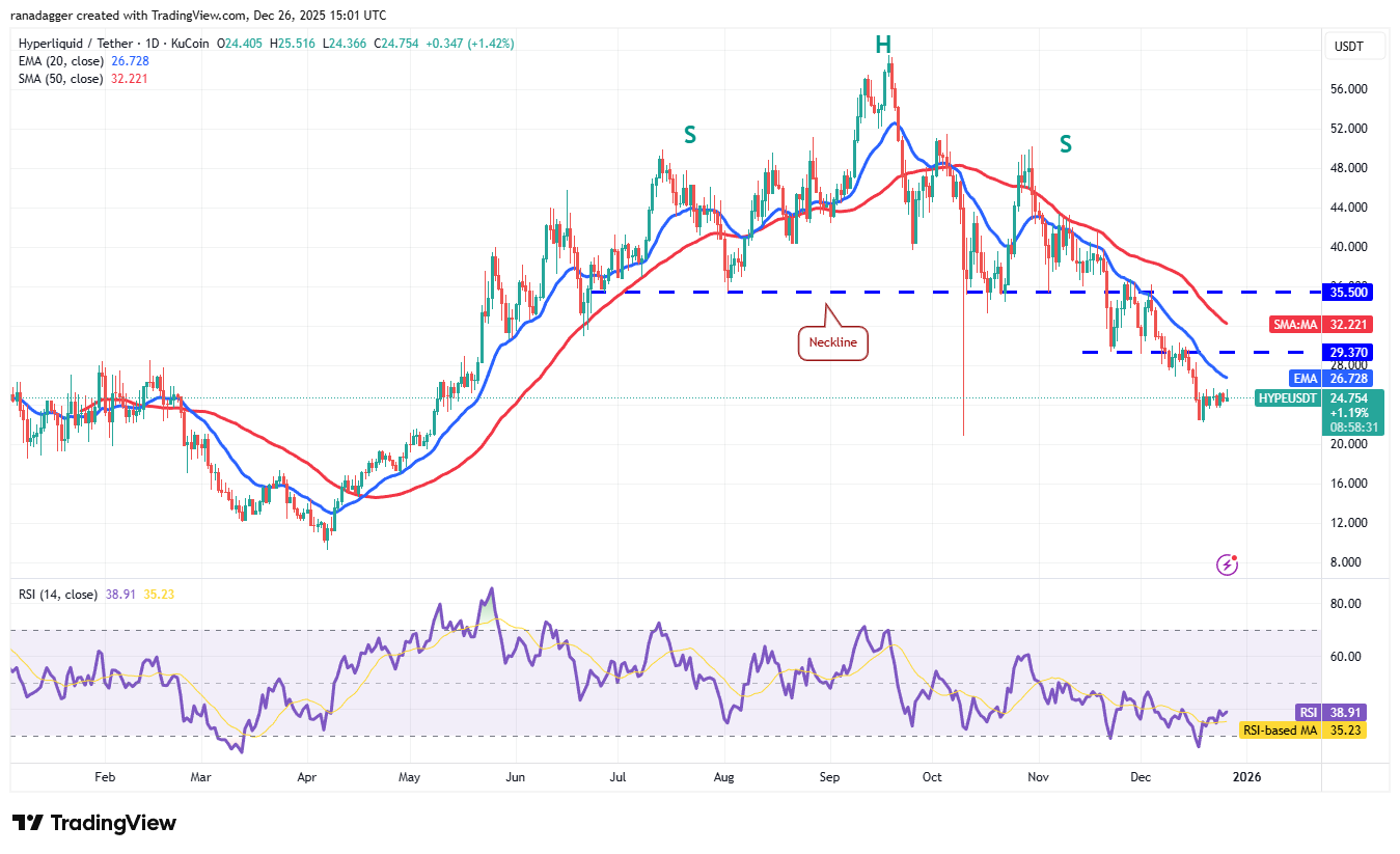 Hyperliquid (HYPE) remains below the 20-day EMA ($26.72), but the bears have failed to sink the price below the $22.19 support.