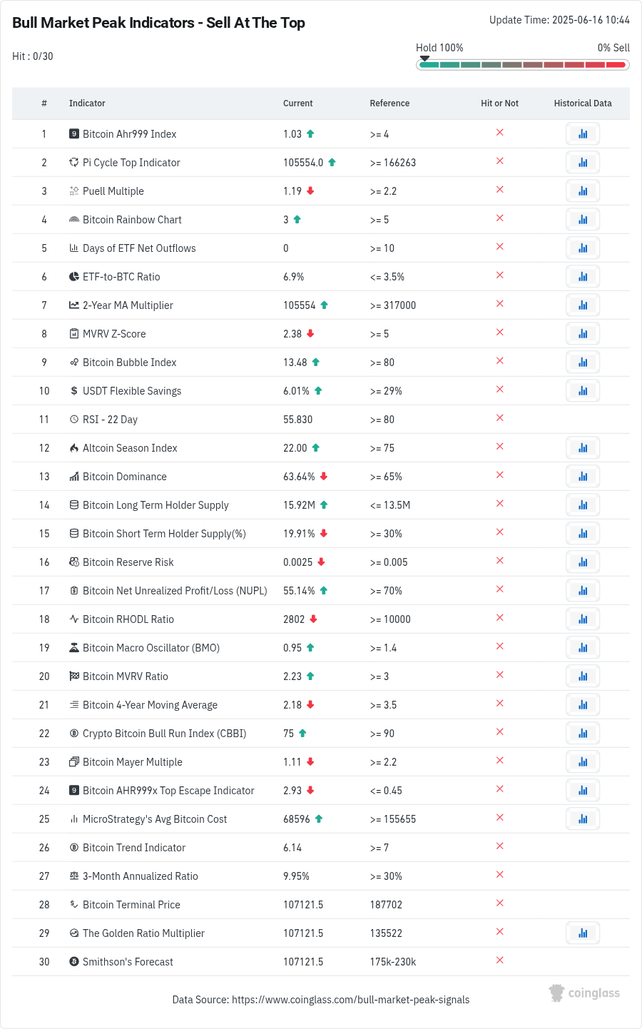As Cointelegraph reported, the “bull market peak” selection of 30 indicators from CoinGlass currently tells investors to “hold 100%” of their allocation.
