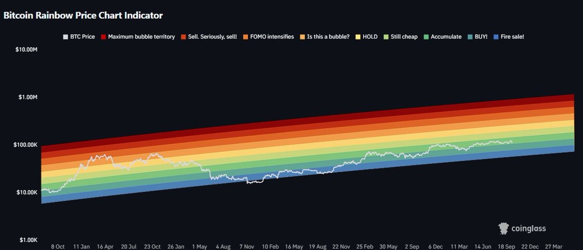 Looking at Bitcoin’s rainbow price chart indicator, the analyst said that the “light green/yellowish region ($140K-$200K)” would probably be a good point to start scaling out more heavily once the price reaches these levels.