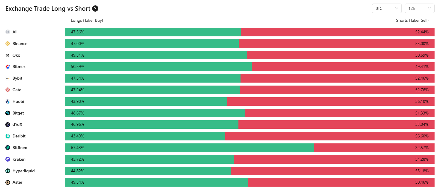 Over 52% of Bitcoin holders across all exchanges are currently short, meaning that they are betting on Bitcoin’s price decline, while only 47% remain long, according to blockchain data from CoinAnk.