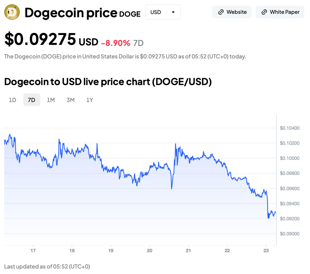 After a brief attempt to reclaim the $0.10 to $0.102 zone around February 21, sellers stepped in fast and the move rolled over into a steady grind lower. Earlier today, the DOGE USDT trading pair dipped to the low $0.09s before a small bounce, putting it at roughly $0.0928 and about 8.9% down on the week.
