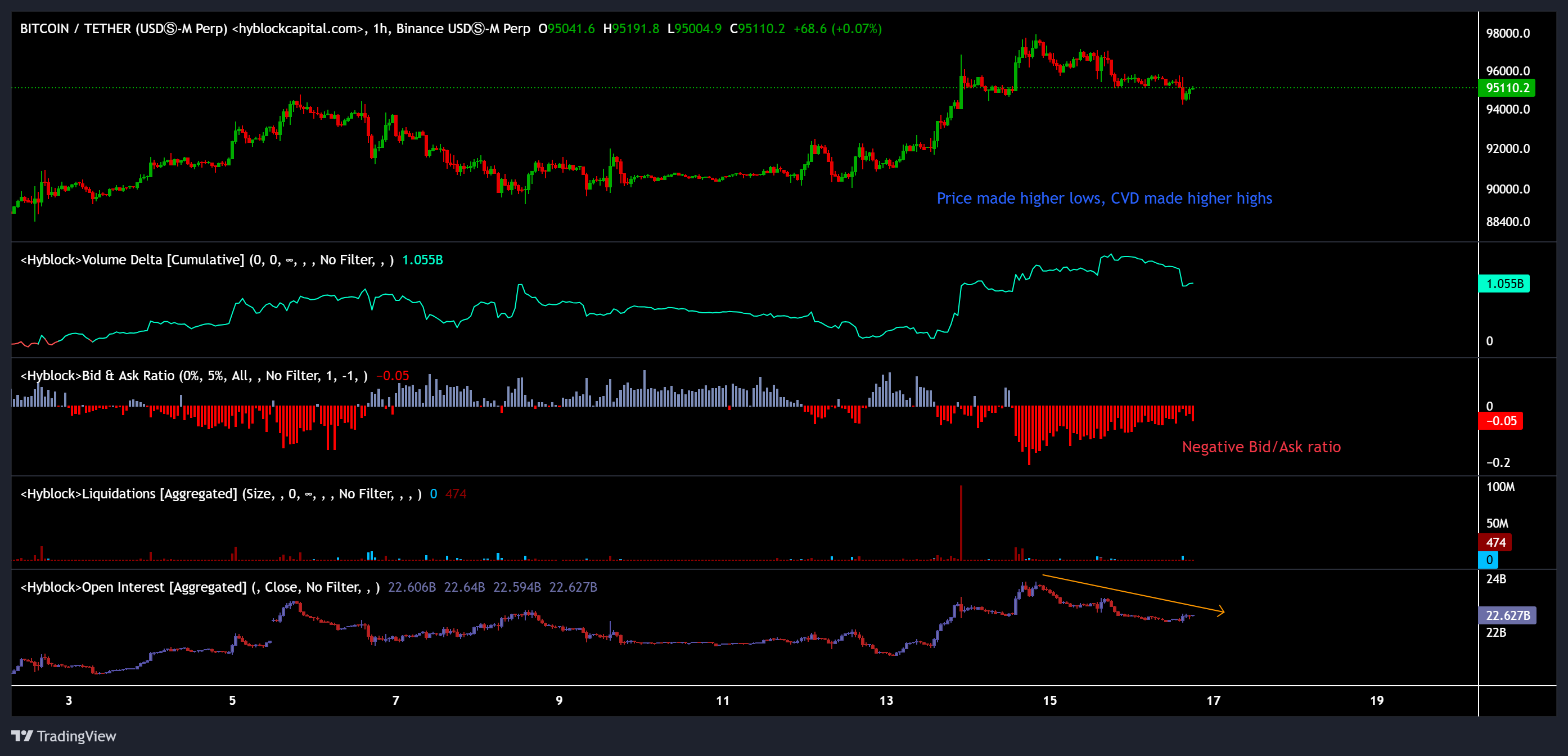 Bitcoin price, CVD, open interest, bid-ask ratio, and liquidation. Source: Hyblock Capital