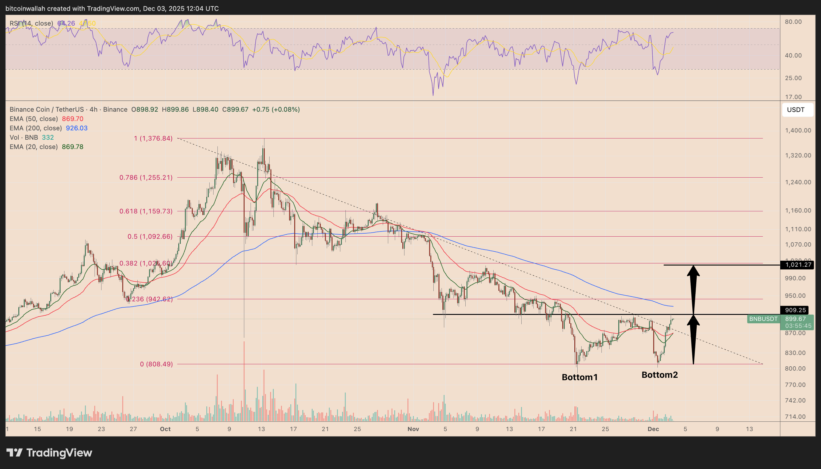 BNB’s rebound is supported by a developing double-bottom pattern on the four-hour chart, which has formed near the $800–$820 demand zone.