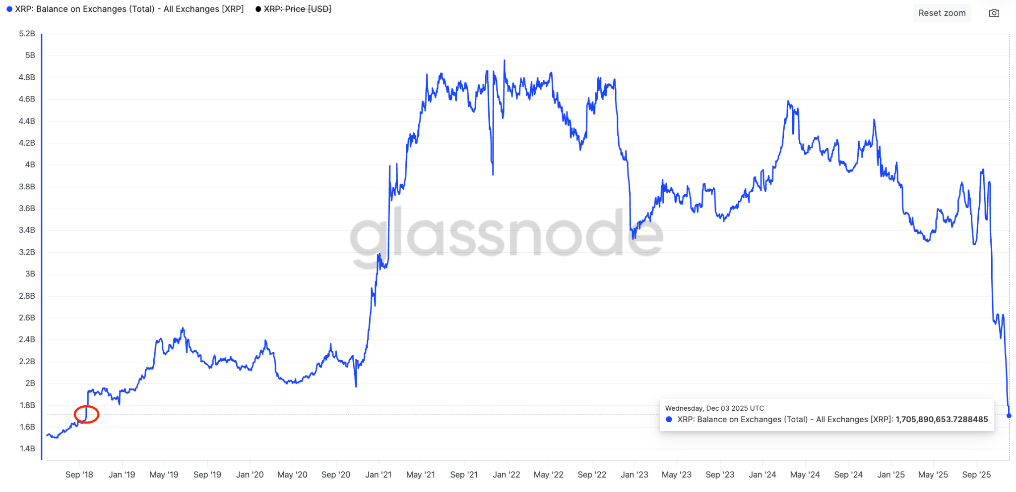 XRP balance on exchanges dropped by 930 million tokens to 2.7 billion on Wednesday from 2.63 billion on Nov. 1, levels last seen in September 2018.