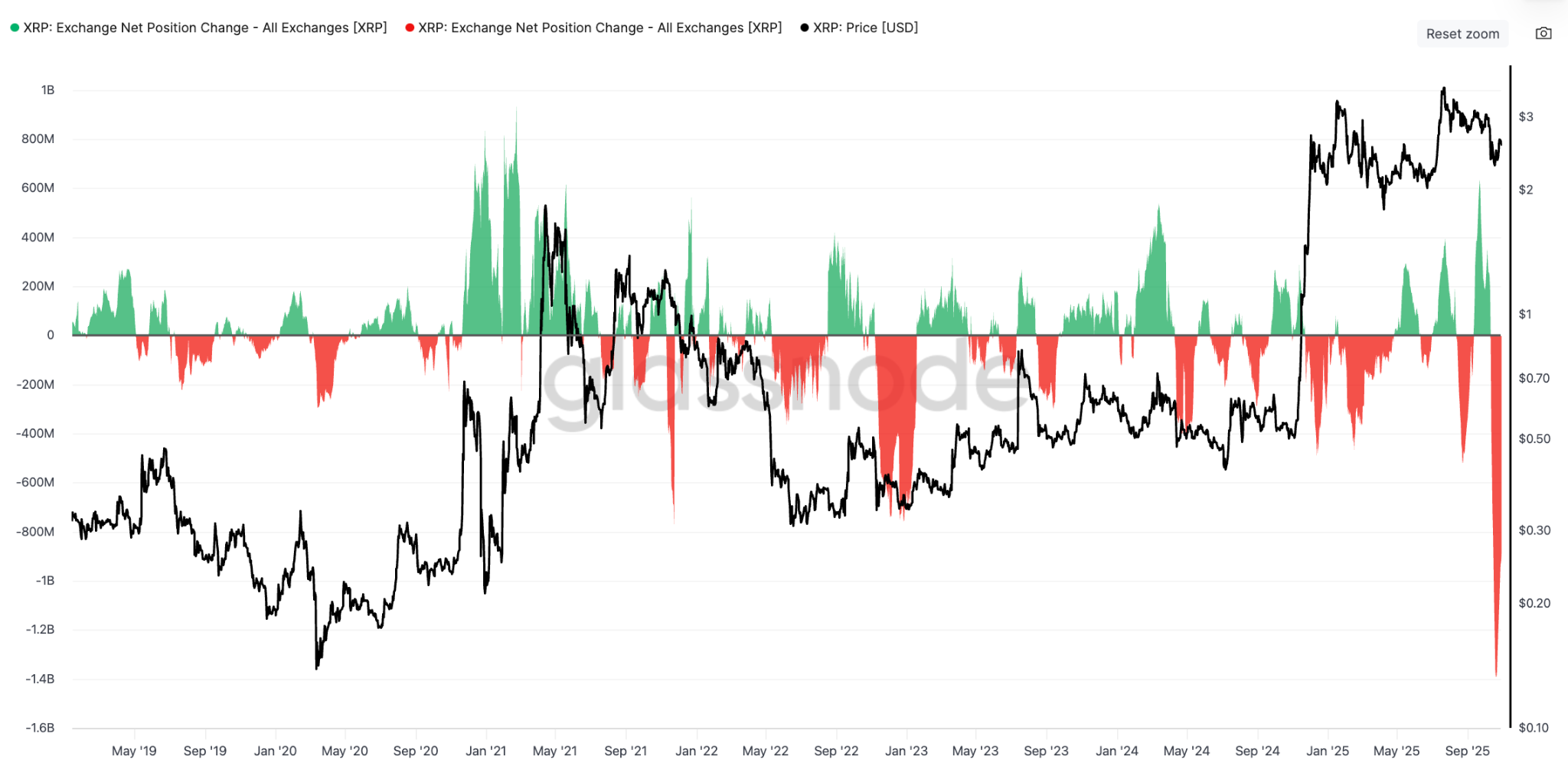 The sharp decline coincided precisely with record exchange outflows, as the XRP net position change among exchanges fell by 1.4 million XRP, marking the largest spike in history, according to Glassnode data.