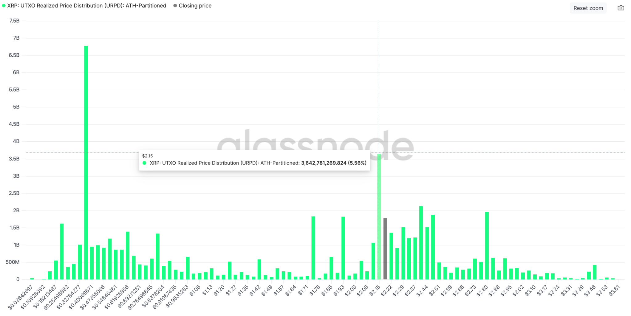 Glassnode’s UTXO realized price distribution (URPD), which reveals the prices at which the current supply was created, indicates that $2.15 is the most significant support for XRP, where investors acquired 3.6 billion tokens.