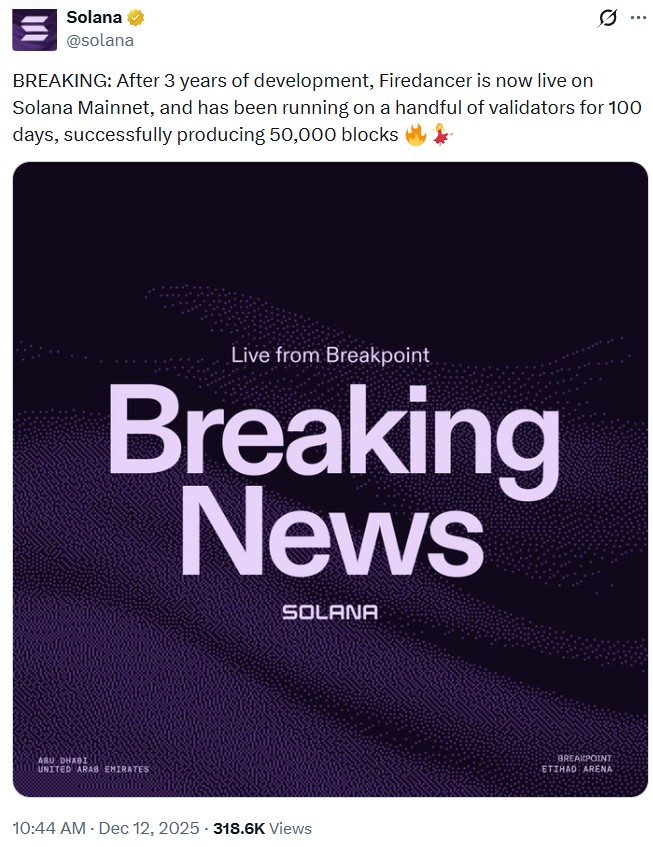 Solana’s Firedancer is now live on mainnet. Source: Solana