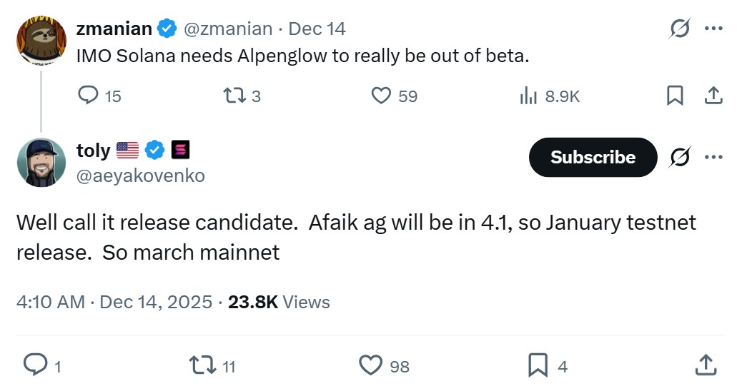 Alpenglow is expected to launch in Q1 of 2026. Source: Zmanian/Anatoly Yakovenko