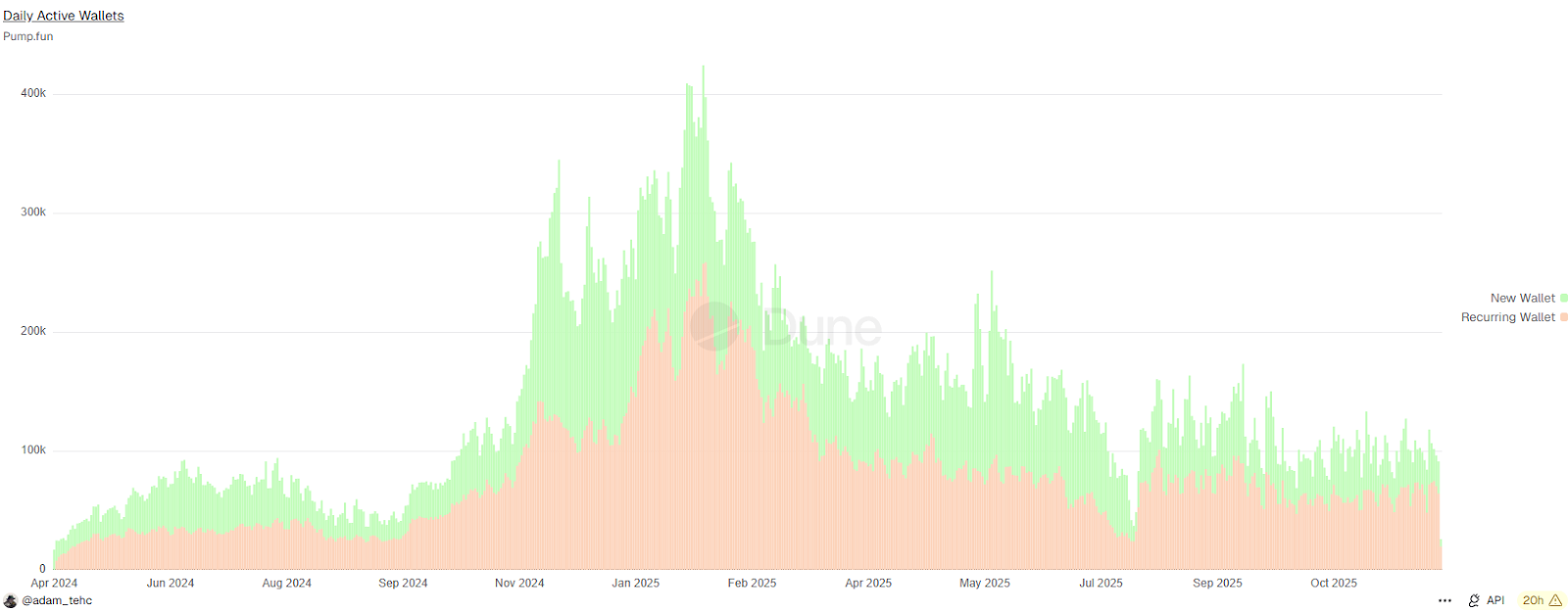 Wallet activity on token launchpad Pump.fun shows the rise of memecoins on Solana. Source: Dune Analytics