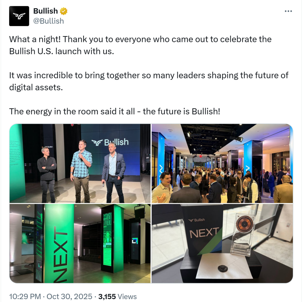 The purchases coincided with Bullish’s US launch event in New York, where the company brought together digital asset leaders to celebrate its expansion. “The energy in the room said it all — the future is Bullish,” the firm posted on X following the event.