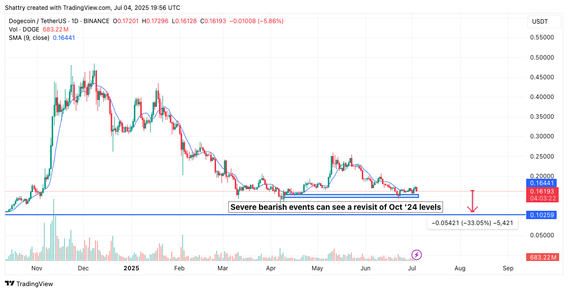 Continued political uncertainty and technical breakdown could drive DOGE toward $0.12–$0.14, representing a 14–26% downside.