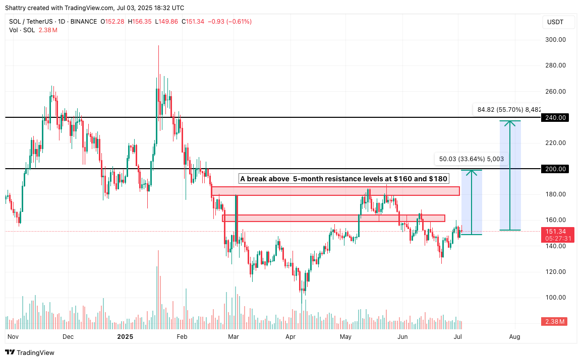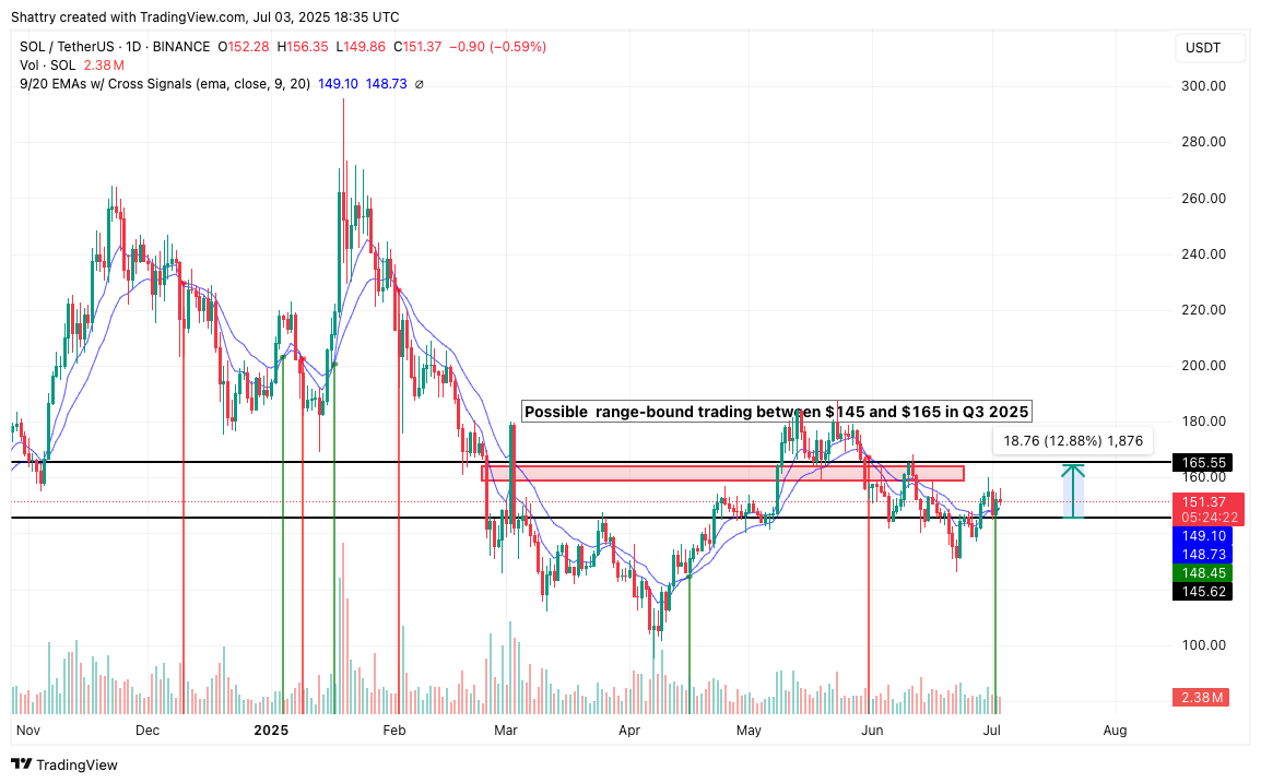 Continued range-bound trading between $145 and $165 could persist through Q3 2025, as institutional positioning develops gradually. This scenario allows technical indicators to reset as the ETF adoption process progresses.
